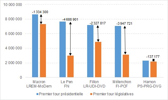 上記記事中でも紹介されているこちらのグラフに明らかなように、大統領選から議会選にかけてとくに得票数を落としたのは左右のポピュリスト政党であった。すなわちルペンの「国民戦線」とメランションの「不屈のフランス」である。それぞれグラフの左端から2番目と4番目に位置している。